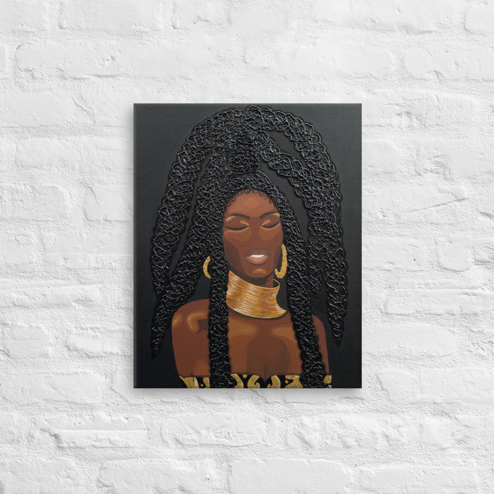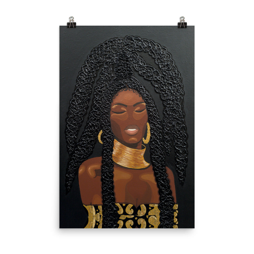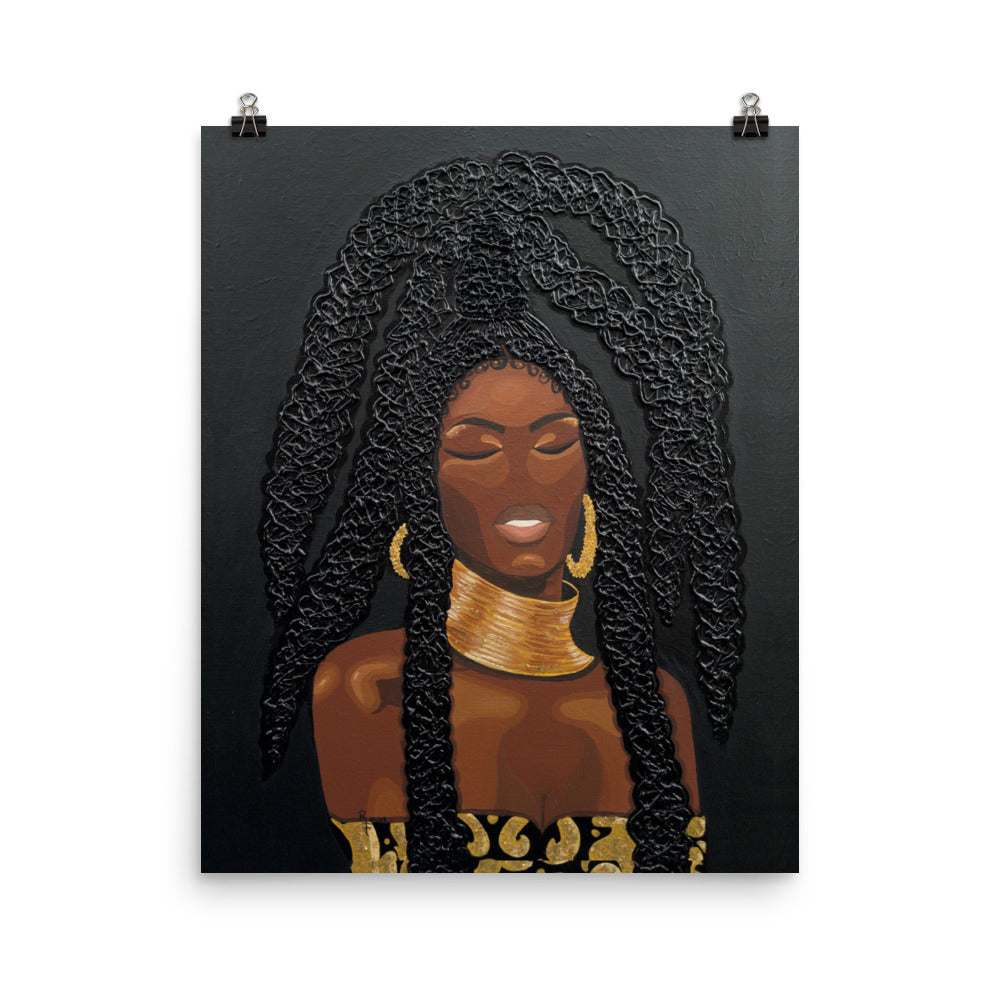 This piece is a portrait inspired by Toronto's R&B fusion/ Dancehall artist Omega Mighty and her look for the cover and release party of her newest EP, Notorious and Noble. I've focused on her beautiful locs using hot glue to create tangible texture. She mentioned in one of her songs that kids teased her in school by calling her Medusa, and in this art piece, I shift the perception on royal portraiture and showcase an expanded view of what nobility looks like.